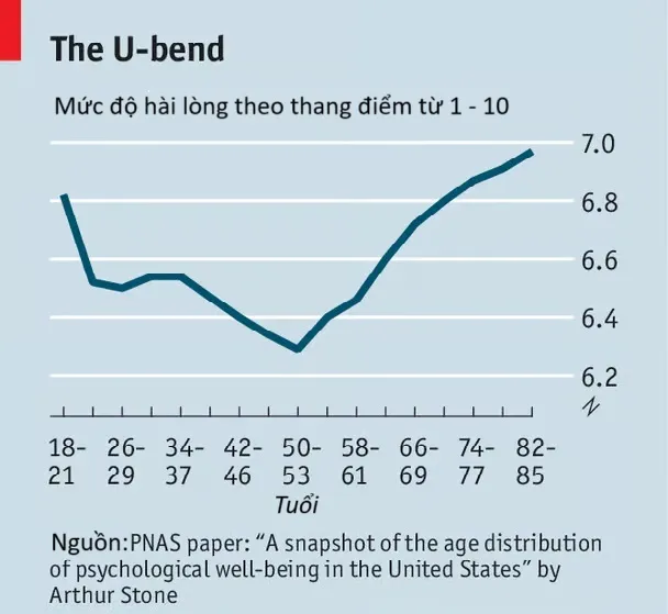 Tuổi trung niên thường là giai đoạn khó khăn nhất trong cuộc đời. Nhà kinh tế học David Blanchflower và Andrew Oswald đã phát hiện ra vào năm 2008 rằng sự hài lòng trong cuộc sống có dạng hình chữ U cong nhẹ, bắt đầu ở mức cao khi còn trẻ, chạm đáy ở độ tuổi giữa 40, rồi phục hồi khi chúng ta già đi. Mô hình này rất mạnh mẽ trên toàn thế giới, ảnh hưởng đến cả nam và nữ. Và nó vẫn tồn tại khi chúng ta điều chỉnh các biến số khác, chẳng hạn như việc làm cha mẹ.